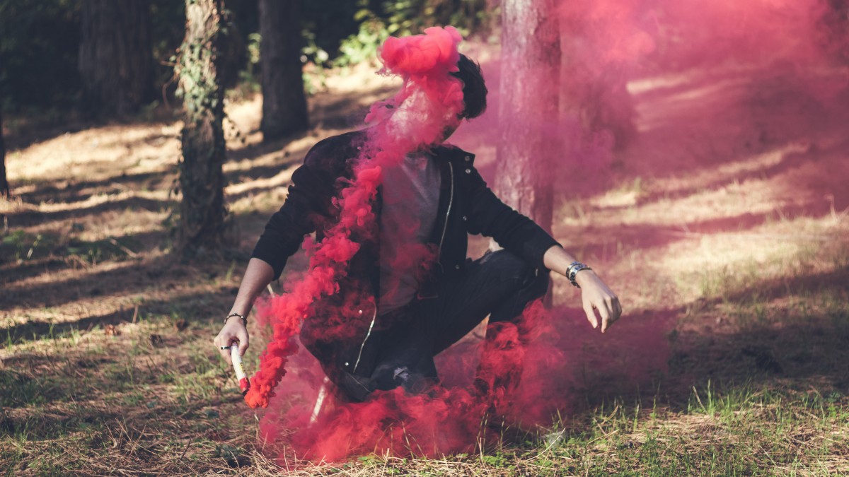 手拿彩色烟雾弹的人
